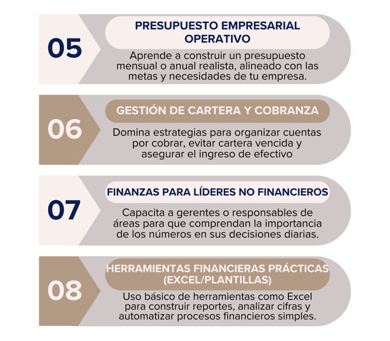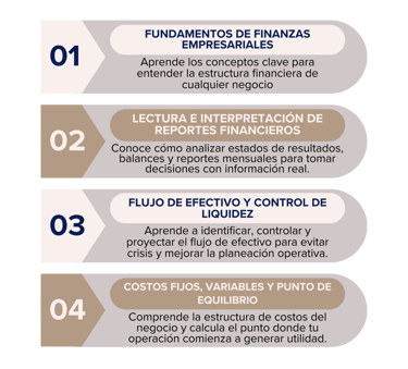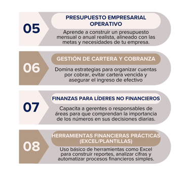Capacita al personal clave de tu empresa en temas financieros fundamentales para la operación: desde el entendimiento de reportes hasta el análisis de costos y flujo de efectivo. Ideal para líderes administrativos, emprendedores o nuevos ingresos que requieren una base sólida para tomar decisiones financieras acertadas.