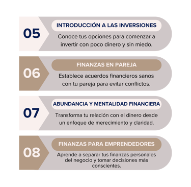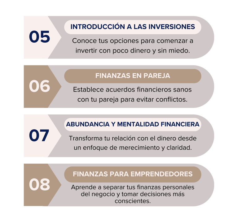 Brindar educación financiera práctica para que aprendas a organizar tus ingresos, ahorrar, salir de deudas o invertir, incluso si empiezas desde cero. El enfoque es claro, cálido y fácil de aplicar.